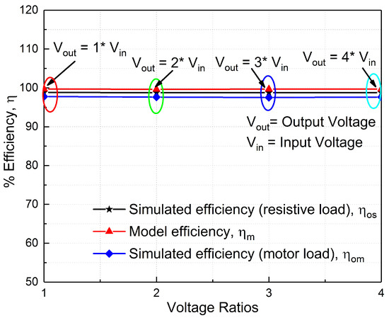 Figure 10 depicts the total efficiency of the proposed converter for motoring and regenerative braking. Table 5 shows the overall comparison of different factors with previous research studies. As a result, the suggested converter has a higher efficiency, fewer switches and capacitors, and lower voltage ripple. In addition, the suggested converter would operate in both forwarding and regenerative modes without requiring any changes to the circuit architecture. In this simulation, the switched capacitor converter provides high efficiency [17] in open-loop conditions as shown in the Figure 10. So the closed-loop system is not necessary for the proposed system for manual transmission. To make a more efficient and speedy operation, closed-loop operation may be considered for automatic switching in Case 3.