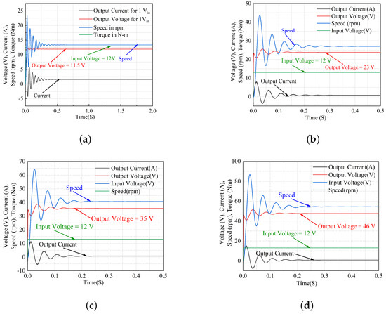 In this case, all the output terminal are connected to the motor load for different ratings. Figure 11 shows that all the loads are connected to the motor terminals and the same terminals are used to be fed back to the battery using regenerative braking. Figure 11a shows this for the output 1 voltage. The same motor parameters are used for Case 4. In Figure 11a, the output voltage is almost equal to the model voltage. The voltage for output 1 is 1 * , which is 12 V. Similarly, for the other outputs, the voltages are 24 V, 36 V and 48 V. Almost all the output voltages are equal to the model voltage, which is shown in Figure 11a–d. Additionally, the motor speed is varied according to the proposed converter voltage to vary the speed which is depicted in Figure 11. In this, the torque is a fixed constant for all the cases. From Figure 11, it is clearly noted that even if you connect all the output ports to be parallel to the motor terminals, the proposed system is able to control the speed and the torque of each terminal without lagging the speed and efficiency of the system.