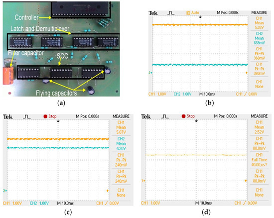 Experimental results of SIMO DC-DC converter. (a) Prototype of SIMO DC-DC converter. (b) Forwarding voltage of . (c) Forwarding and regenerative voltage of 4. (d) Forwarding output voltage of 3.