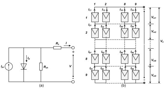 (a) Equivalent circuit of single-diode PV model. (b) TCT configuration of PV array.