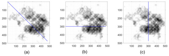 Three case studies of MC on studied PV array (The blue lines show directions of the MC). (a) Case 1. (b) Case 2. (c) Case 3.