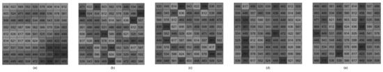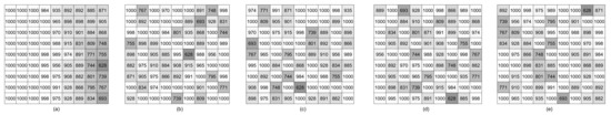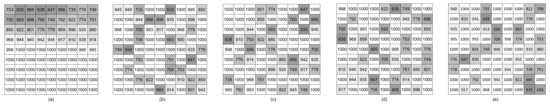 Shading distribution on PV array under the center of the cloud. (a) Before reconfiguration. (b) After original-PSO-based reconfiguration. (c) After the original-Rao-based reconfiguration. (d) After the proposed PSO-based reconfiguration. (e) After the proposed-Rao-based reconfiguration.