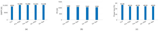 Comparison of performance metrics of PV array under the top edge of the cloud. (a) GMPP. (b) PE. (c) PL.