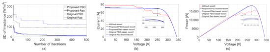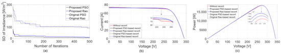 Comparison of characteristics of PV array under the right edge of the cloud. (a) Objective function over iterations. (b) I-V curves. (c) P-V curves.