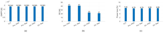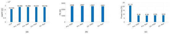 Comparison of performance metrics of PV array under the center of the cloud. (a) GMPP. (b) PE. (c) PL.