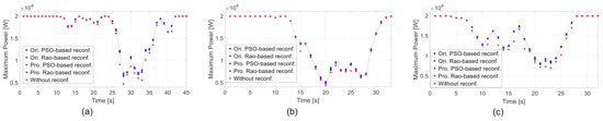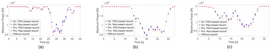 Comparison of maximum output power profiles of TCT-configured, original-PSO-reconfigured, original-Rao-reconfigured, proposed-PSO-reconfigured, and proposed-Rao-reconfigured PV arrays under three shading cases with lagged time. (a) Case 1. (b) Case 2. (c) Case 3.
