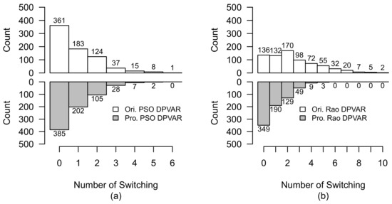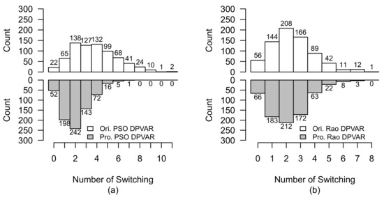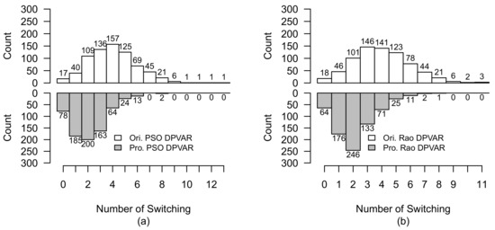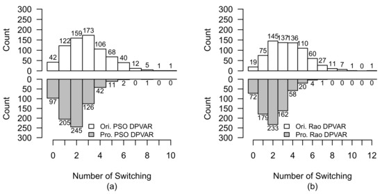 Comparison of switching operation of original-reconfigured and proposed-reconfigured PV arrays under Case 2 without lagged time. (a) PSO-reconfigured PV array. (b) Rao-reconfigured PV array.