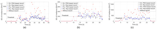 Comparison of SDI of TCT-configured, original-PSO-reconfigured, original-Rao-reconfigured, proposed-PSO-reconfigured, and proposed-Rao-reconfigured PV arrays under three shading cases with lagged time. (a) Case 1. (b) Case 2. (c) Case 3.