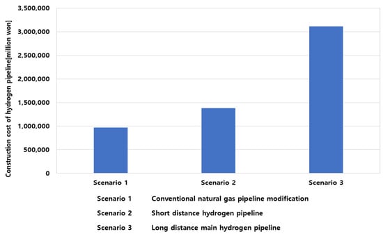 The hydrogen pipeline construction cost was calculated for each scenario. It was assumed that the hydrogen pipeline network was built nationwide in the same way as the existing natural gas pipeline network. Table 5 shows the construction cost of Scenario 1. It was confirmed that the pipeline with a diameter of 30″, which was widely used as the main pipeline, was built the longest, accounting for about 71.2% of the total cost.