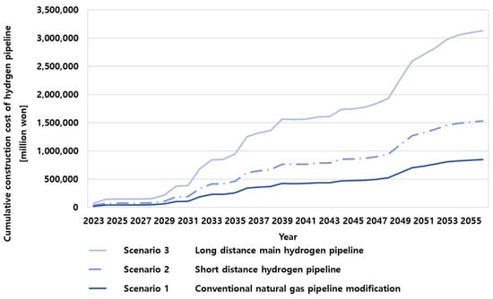 The total hydrogen pipe construction cost according to each scenario and the construction cost by year are shown in Figure 1 and Figure 2, respectively. Scenario 1 was the case of modifying existing natural gas pipelines, and it was confirmed that the cost was lower than Scenario 2 and 3, which were the cases of building new hydrogen pipelines. Scenario 2, which built a short-distance hydrogen pipeline, and Scenario 3, which built a long-distance main hydrogen pipeline, cost about 1.8 times and 3.7 times as much as Scenario 1, respectively.