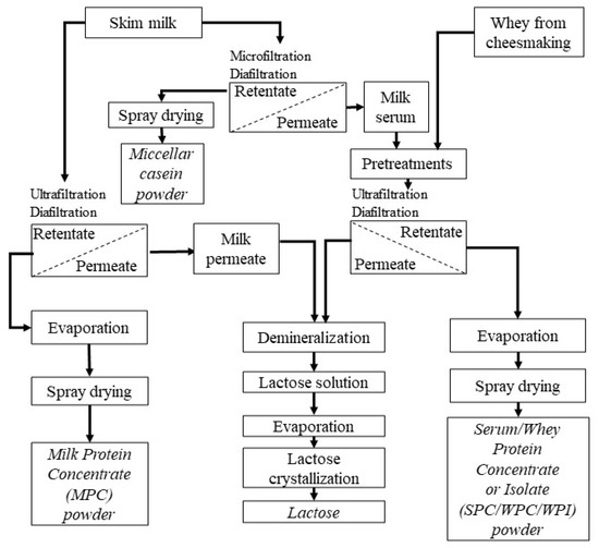 Flow diagram for concentration of proteins and lactose production in dairy industry. The final products are marked in italics.