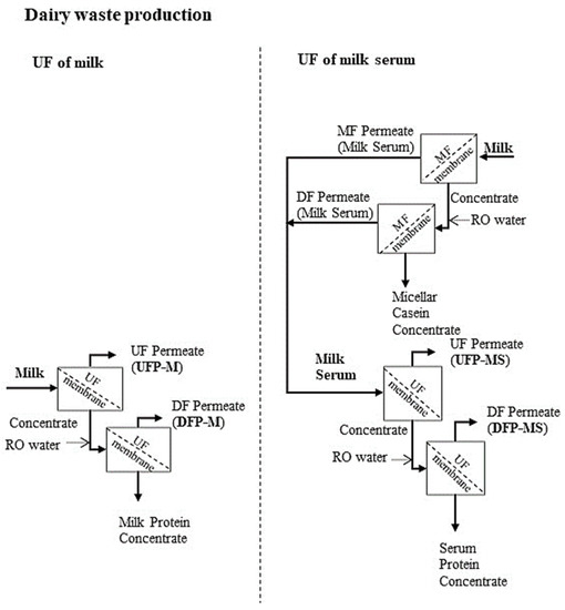 The ultrafiltration permeates (UFP—wastes from dairy processing) used in research experiments were obtained from Dairy Research and Development Center located at University of Warmia and Mazury in Olsztyn. These permeates were produced from ultrafiltration (UF) and diafiltration (DF) processes of two different dairy products (100 L of milk and 170 L of milk serum, Figure 2). The UF and DF processes were carried out using UF module (Koch Membrane Systems, Wilmington, MA, USA) fitted with 3838-HFK-131 membrane (spiral wound element; semipermeable polyethersulfone layer on a polyester backing material) with a membrane area of 6.7 m2, molecular weight cut-off value of 10,000 Da, and a feed spacer model N 31 mil (used in accordance with manufacturer’s specifications). The unit was operated under a constant transmembrane pressure of 4 bar at 50 °C for either UF or DF processes. Milk was ultra-filtrated to achieve a concentration factor of approximately 4.6×. The UF retentate was diluted with reverse osmosis water at 50 °C to bring the weight back to the original total weight of the starting feed for DF. Then, the diluted UF retentate was diafiltrated to achieve a concentration factor of 6.6×. Diafiltration was continued until the protein content of the retentate, measured by MilkoScan™ FT2 (Foss, Hillerød, Denmark), was 13.5%. Milk serum was UF to achieve a concentration factor of approximately 5.5×. The UF retentate was diluted with reverse osmosis water at 50 °C to bring the weight back to the original total weight of the starting feed for DF. Then, the diluted UF retentate was diafiltrated to achieve a concentration factor of 8.5×. Diafiltration was continued until the protein content of the retentate, measured by MilkoScan™ FT2 (Foss, Hillerød, Denmark), was 2.2% of protein in the retentate. The permeates were sampled in a representative manner, and then stored at 4 °C.