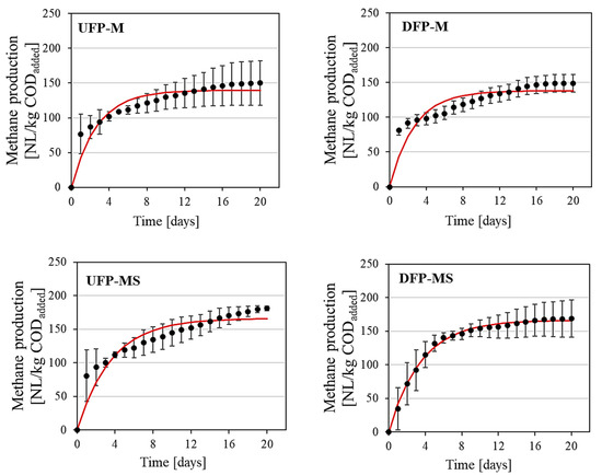 Comparison between measured data (points) and data calculated with the first order regression (red line) for specific methane production from ultrafiltration permeates in the 20-day test: UFP-M = milk ultrafiltration permeate; DFP-M = milk diafiltration permeate; UFP-MS = milk serum ultrafiltration permeate; DFP-MS = milk serum diafiltration permeate. The gas from the inoculum has been subtracted and the data have been expressed as volume of CH4 per kg of CODadded.