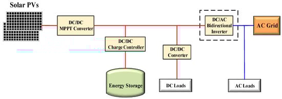 With the development of efficient DC distribution systems in buildings in recent years, it has commonly been assumed that the combination of different energy sources could enhance performance. However, it has been shown that the DC system performance could vary in terms of efficiency depending on load profile, utilized renewable energy sources, and utility grid integration [10]. Figure 1 illustrates a general schematic configuration of DC distribution systems in buildings, including renewable energy sources (PV in this case), energy storage, and a mix of AC and DC loads [24,25,26,27]. The system contains a power optimizer known as a maximum power point tracking (MPPT) to maximize the PV output power under different weather conditions [28]. In addition, a step-up/down DC/DC power converter is implemented for charging/discharging the energy storage and to control the power flow to regulate the voltage level of the DC bus.