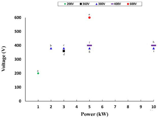 A comparison of the existing empirical literature on DC-bus voltage versus power integrated with a single-phase bidirectional inverter is illustrated in Figure 3. Based on the results, it may be observed that once the power level is high, the voltage typically corresponds to that of the peak mains, i.e., √2 times the root mean square (rms) voltage. It can be seen that the majority of the DC bus voltage levels fall somewhere in the region of 380 to 400 V. High-voltage operation (i.e., 600 V) is applied in cases where two voltage levels (600 V/300 V) may be required, allowing for the adaptability of DC load connection. Nevertheless, it is possible to conclude that the high power and voltage level (i.e., 10 kW and 600 V) is not appropriate for residential buildings from a safety perspective, despite the fact that it provides a high level of efficiency.