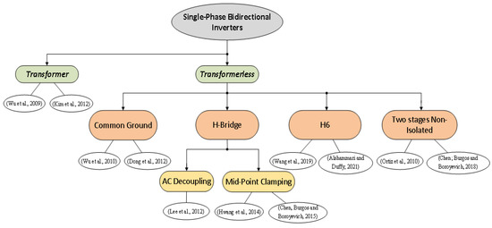 Classification of single-phase bidirectional inverter topologies integrated with a DC distribution system. (We et al., 2009)—[63]; (Kim et al., 2012)—[51]; (Wu et al., 2010)—[52]; (Dong et al., 2012)—[44]; (Lee et al., 2012)—[43]; (Hwarg et al., 2014)—[39]; (Chen, Burgos and Boroyevich, 2015)—[56]; (Wang et al., 2019)—[53]; (Alshammari and Duffy, 2021)—[54]; (Ortiz et al., 2010)—[64]; (Chen, Burgos and Boroyevich, 2018)—[57].