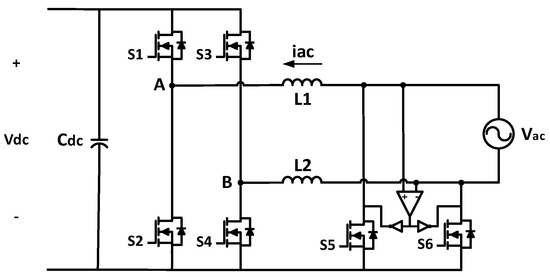 Another issue with the H4 topology is that it, too, suffers from power loss due to leakage current through the parasitic capacitance of the PVs [73]. In order to overcome this effect, the authors of [43] propose a solution that provides two additional current paths on the AC side, where the inverter output is driven into three levels of VAB (Vdc, 0, and –Vdc), as depicted in Figure 8. Since the rate of change in voltage across the parasitic capacitance (ground capacitor) is reduced, this design can limit high-frequency components and reduce leakage current. As a result, the inductor loss during freewheeling is reduced, while injected reactive power from the grid is reduced in the case of zero crossing. Due to the fact that the topology operates as a boost in rectification mode, the DC-link voltage limitation is required to be nearly twice as high as the power grid’s peak voltage. However, there is no capacitor connected to the AC terminals, which impacts the EMI performance. High efficiency was achieved in this case but is partly owing to the use of oversized semiconductor devices relative to the design specification.