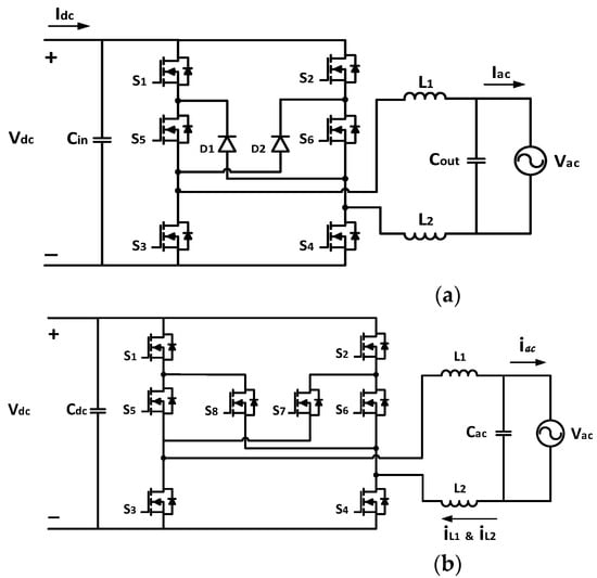H6 bidirectional inverter topology: (a) standard H6 [53] and (b) synchronous H6 [54].