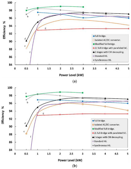 Finally, the efficiency of the different topologies is compared in Figure 13 for both inversion and rectifier modes. These results have been extracted from the measurement data presented in the publications. For a fair comparison, ref [63] was excluded since its power is significantly lower (300 W). As can be seen, the majority of topologies provide relatively high efficiency at full load. It is worth noting that the highest efficiency of [43] comes from using 75 A oversized semiconductor devices at 3 kW. The next highest efficiency is achieved with a two-stage solution that includes CM decoupling, but it has high cost and size due to additional components. Next comes the H6 topology [48], but its efficiency drops rapidly at low power.
