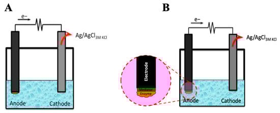 Principal scheme of (A) enzyme-based mediator-free biofuel cell and (B) mediated enzyme-based biofuel cell.