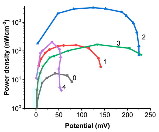 The dependencies of the maximum power density on the potential when the system is: 0—control of the study, 1—EBFCCC; 2—EBFCCA; 3—EBFCChV; and 4—EBFCHep.