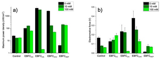 Figure 3 compares the power density (Figure 3a) and electromotive force (Figure 3b) of all biofuel cells at a glucose concentration of 10 mM in the solution. The voltage decrease usually is registered when the load of the external circuit increases [].