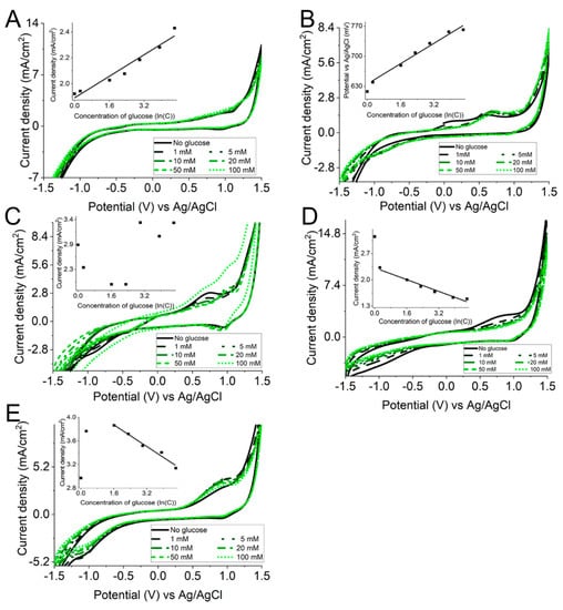 During the evaluation of the cyclic voltammetry results, the focus was on the value of the potential at which oxidation peak is observed in the cyclic voltammogram (CV). During this experiment the potential was changed in a rather broad range of the potential values, i.e., the potential was changed from −1.5 V to +1.5 V at the scan rate of 50 mV/s (Figure 4). The potential cycling in such a broad range of electrode potentials required the very careful removal of dissolved oxygen by degassing the electrochemical system with a nitrogen stream. It was observed that in the system without any redox mediator (Figure 4A), no clearly distinguished oxidation peak was observed. However, in this system, a slightly expressed current density increase at the potential value of +1.1 V followed. The current density changes correspond to the linear correlation with R² = 0.95 and y = 0.11x + 1.85. The current density was rather different in the evaluated EBFC systems. In the EBFCCC (Figure 4B), a shift was observed in the oxidation peak potential value. The observed potential value was shifted to higher potential values with increased glucose concentration. The potential values were shifted from +0.63 V to +0.77 V. Meanwhile, no current density dependence on glucose concentration was observed in this system. Such a shift of the potential value was not observed in any other evaluated system. During potential cycling at the increased glucose concentrations, a drop in the current density was observed in the EBFCCA (Figure 4C) and EBFCHep (Figure 4E). No current or potential dependencies were observed in EBFCChV.