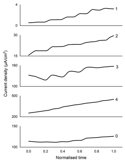 Chronoamperometry data on: 0—control of the study; 1—EBFCCC; 2—EBFCCA; 3—EBFCChV; and 4—EBFCHep electrodes. The LOWESS function utilizing a point interval of 10% was used.