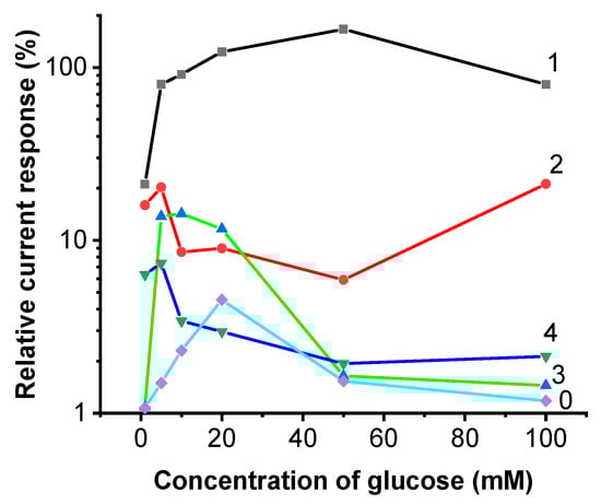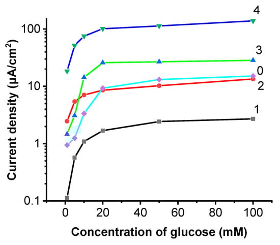 Current density dependency on glucose concentration. ΔJ, log10(Ji − J0) from the concentration of glucose, where Ji—current density is measured after the addition of glucose, and J0—current density is measured at the start of the experiment: 0—control of the study; 1—EBFCCC; 2—EBFCCA; 3—EBFCChV; and 4—EBFCHep.