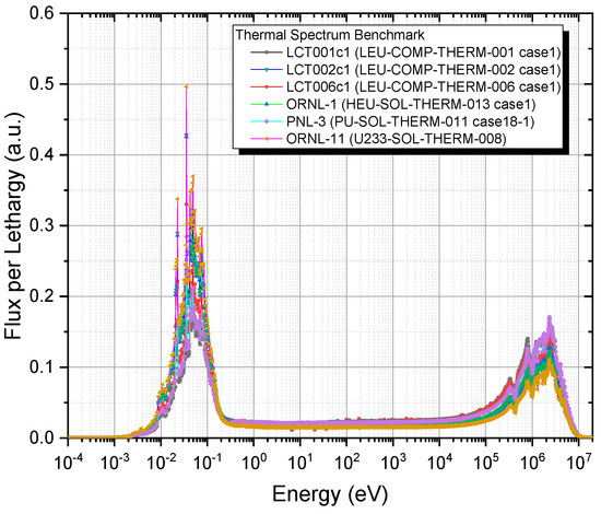 Table 2 lists the 85 selected ICSBEP benchmark problems, providing benchmark IDs, categories, reference keff, and short IDs for the sake of convenient reference. The McCARD inputs for each ICSBEP benchmark problem were prepared. All the McCARD calculations were performed by employing 10,000 neutron particles per cycle with 1000 active cycles and 50 inactive cycles. The initial neutron sources were uniformly distributed in the system boundary for MC eigenvalue calculations. Figure 2 and Figure 3 show the neutron energy spectra for five fast benchmarks (i.e., Jezebel, Jezebl-240, Godiva, Flattop-25, and Jezebel-233) and six thermal benchmarks (i.e., LCT001c1, LCT002c1, LCT006c1, ORNL-1, PNL-3, and ORNL-11), respectively. In the fast benchmarks, the energy spectra are similar to the energy distribution of neutrons from fission reactions. In the thermal benchmarks, the neutron energy spectra are attributed to neutron moderation or slowing-down. As shown in Table 2, the thermal scattering law (TSL) sub-library for light water was only used in this ICSBEP benchmark analyses.