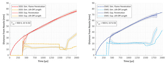 In the following section the numerical results are compared to the experimental measurements. The general idea of the spray modeling in this work follows the logic of stepwise validation for single and multi-injection simulations. The first step is the validation of the CFD model in evaporating inert chamber conditions (Ai in Section 2.3). Special focus is hereby placed on liquid and vapor penetration, spray dispersion as well as mixing. The validated spray model is then transfered into a reacting chamber atmosphere utilizing the reactions mechanism for the respective fuel described in Section 2.4.5. The combustion results are validated in terms of ignition delay, flame lift-off and propagation. Additionally the ignition zones and mixture stoichiometry are identified by transferring the simulation domain into mixture fraction (Equation (8)) and oxygen equivalence ratio (Equation (10)) space illustrating the mixing field of the hot reactive regions.