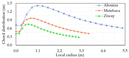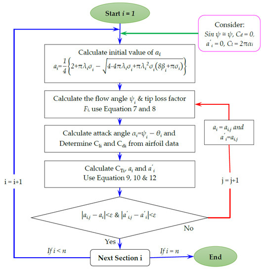- The geometrical parameters of the wind turbine blade were also analyzed and determined using the BEM method via MATLAB coding in an iterative process. The local axial and tangential induction factors, angles of attack, blade tip loss factors, thrust coefficients, and power coefficients of blades for each section of the blade’s span were converged by the developed MATLAB code.