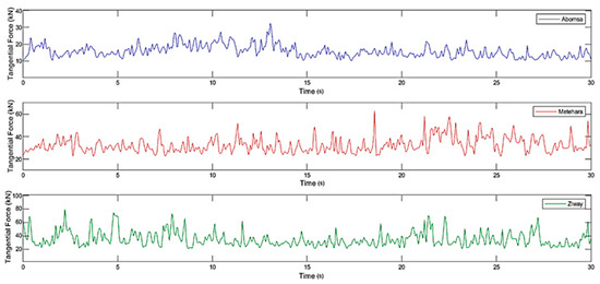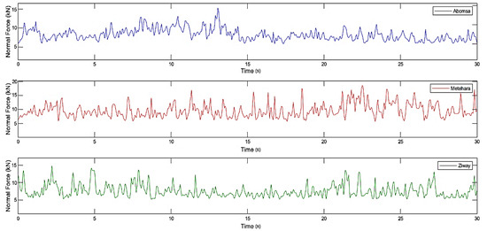 - The dynamic response of wind turbine blade behaviors and the tangential and normal aerodynamic loads exerted on the blade were simulated and presented based on variable wind speeds of three sites. With variable wind speeds of 0.5–7.9 m/s, 1.5–7.3 m/s, and 1.0–8.2 m/s for three sites are inserted into systems, the dynamic response and the tangential and normal aerodynamic loads exerted on the blade for three site blades varying with the times were obtained, and 32.87 kN and 66.33 kN, 80.21 kN and 15.12 kN, and 18.03 kN and 14.82 kN are the maximum tangential and normal loads exerted on the blades of Abomsa, Metehara, and Ziway, respectively.