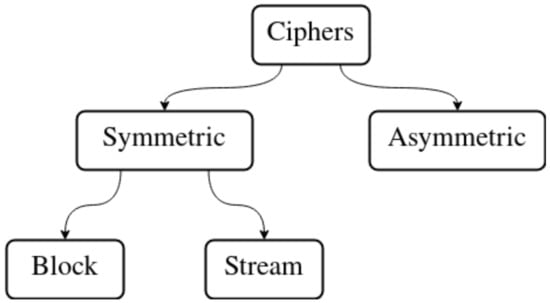 Ciphers are divided into two categories as seen in Figure 1: symmetric ciphers and asymmetric ciphers. Symmetric ciphers use the same key during encryption and decryption, while asymmetric ciphers use two distinct, albeit related keys for each operation. The difference does not have any security implications—neither type of cipher is inherently “more secure”. Instead, it necessitates different assumptions about the privacy of the key. This in turn causes each type of ciphers to have different use cases. In practice, both types often are used together. This way they are able to complement each other. Symmetric ciphers can further be divided into stream and block ciphers. Stream ciphers encrypt and decrypt one bit at a time. Block ciphers operate on blocks of data, which have fixed length usually defined in bits or bytes. Encryption and decryption algorithms of such ciphers take a block of data of specified length as input and produce a different block of data of the same length.