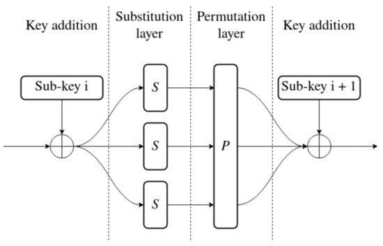 Iterated ciphers may be implemented in a multitude of ways. One of them is a substitution–permutation network (SPN), as seen in Figure 3. This type of construction is divided into two layers: the substitution layer and permutation layer. The role of the first one is to achieve nonlinearity. This means that the cipher is more difficult to approximate with linear functions. This mitigates attacks based on linear cryptanalysis [11]. Nonlinearity is achieved by using a function usually called an S-BOX. Substitution is the act of replacing one value with another. It is often implemented using a lookup-table (LUT) to allow any possible mapping from input to output. The other part of an SPN is a permutation layer. Its role is to mix the bits of the state together. This layer might only swap bits around, or also mix them using XOR, matrix multiplication or other operations. In the end, the purpose of the P-BOX is to increase diffusion. Making bits of state change positions with each round causes each bit of the output to depend on multiple input bits.