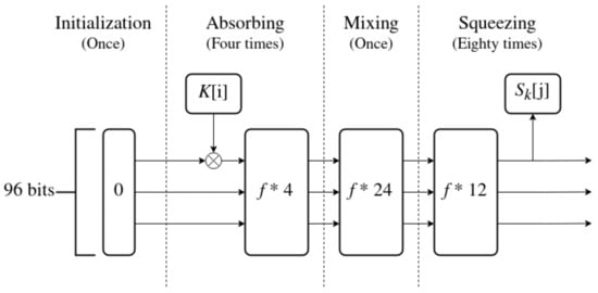 Key expansion is split into four stages, as seen in Figure 5. The stages, in order, are: initialization, absorbing, mixing and squeezing. Initialization, absorbing and squeezing are all standard phases of the sponge construction.The mixing stage might be thought of as part of the squeezing stage, with output discarded. It is added to increase the amount of work performed on the internal state before output words are collected. The function f is defined later in this section.