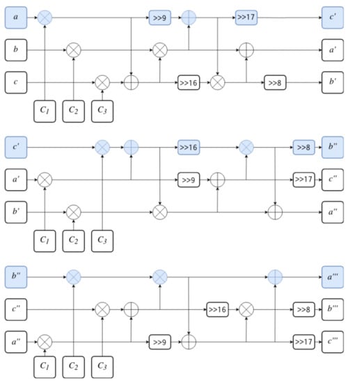 The function is designed as three applications of a function (“f one-third”), which is presented in Figure 6. It splits input state into three 32-bit words a, b and c. Then, it applies constants , and to the state using XOR. This is followed by a series of ARX operations between the words. In the end, the state is rotated one position to the right to produce the output words, , and .
