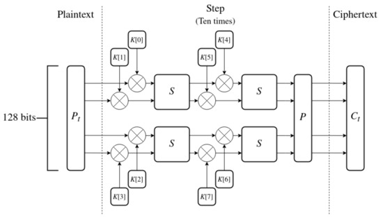 - Rodinko, M.; Oliynykov, R. Comparing Performances of Cypress Block Cipher and Modern Lighweight Block Ciphers on Different Platforms. In Proceedings of the 2019 IEEE International Scientific-Practical Conference Problems of Infocommunications, Science and Technology (PIC S&T), Kyiv, Ukraine, 8–11 October 2019; pp. 113–116. [Google Scholar]