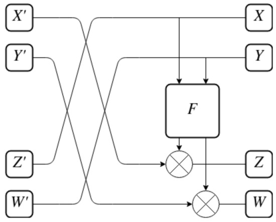 It is worth mentioning that the inverse of the P-BOX must be found. This structure is presented in Figure 12. It is used to reverse the order of operations: the application of the F function and the reordering of halves. What is important is that the F function itself stays the same. It is one of the advantages of the Feistel-like structure on which the P-BOX is based.