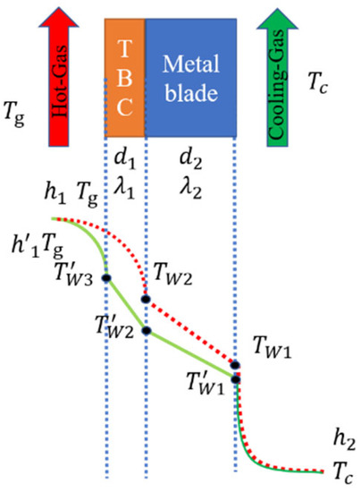Similarly, the function of the coating is reflected in its thermal resistance and the resulting external convection heat transfer coefficient . Therefore, we can obtain the relationship between the temperature-drop of the coating itself (), which is a current evaluation of the TBC effect and the temperature-drop difference between the external surface of the metal blade with or without coating (), of which aero-engines really consider. Furtherly, we can obtain the corresponding increase in turbine inlet temperature. This has a certain reference value for understanding the thermal insulation mechanism of the TBC and can help to further establish a more reasonable evaluation of the TBC effect.