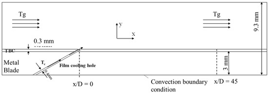 As shown in Figure 2, hot gas convection heat transfer with TBC and cooling air enters the fluid domain from the film-hole to simulate the film-cooling effect; meanwhile, the convection heat transfer boundary conditions are set in the internal metal surface. Hence, the working state of the outer film heat transfer–TBC–internal heat transfer downstream of the film-hole can be approximately simulated.