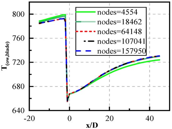 The computational domain is meshed by a structured grid and the boundary layer grid is locally refined on the film-hole and external surface of TBC in order to let first layer . The simulation adopts the shear stress transport (SST) k-ω turbulence model, which has been employed and proven to be able to predict the temperature distribution of vane with film cooling [23,24,25,26]. To confirm mesh independence, we chose mesh numbers 107041 via the cases with mesh numbers ranging from 4554 to 157950 in Figure 3.