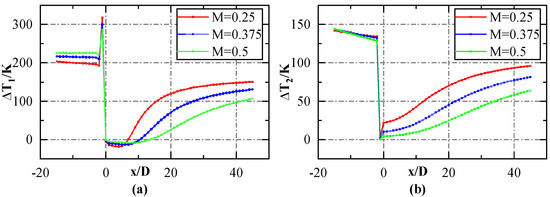 Figure 4 shows the variation of and at different BR under and . It indicates that downstream from the film-hole, the temperature-drop of the coating itself () and the temperature-drop difference between the external surface of the metal blade with or without coating () increase significantly as the x/D increases, and then the increasing trend gradually slows down. As BR increases from 0.25 to 0.5, the value of and is reduced; however, there is not much difference between the variation of the two temperature-drops, which shows a relatively good corresponding relationship of the two.