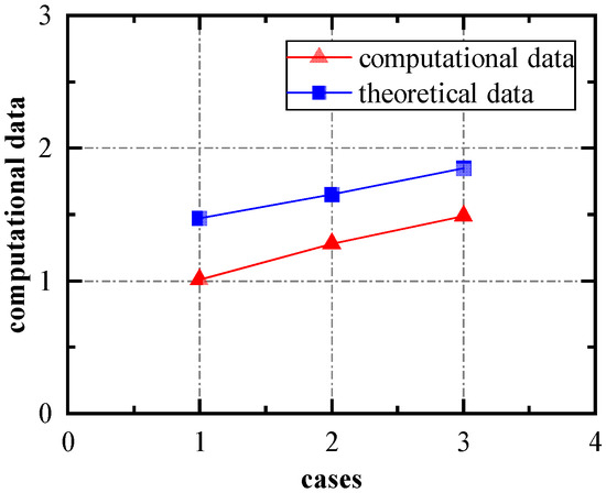 In order to verify Equation (5), it is necessary to calculate the temperature-drop of the coating itself () and the temperature-drop difference between the external surface of the metal blade with or without coating () at x/D = 30 under different conditions. Table 2 and Figure 5 shows the comparison of the calculated and theoretical results, in which the temperature-drop ratio matches well under different BR and h2. However, there is a difference in value between the calculated results and theoretical results, which is because the computational model is not an ideal 1-D heat transfer model; thus, heat transferring is in a mainstream direction between the coolant gas in the film-hole with TBC and the metal part. In summary, Equation (5) verifies that variation law is basically the same as the temperature-drop of the coating itself () and the temperature-drop difference between the external surface of the metal blade with or without coating ().