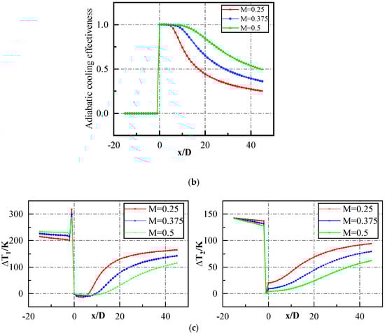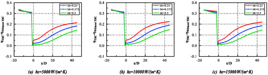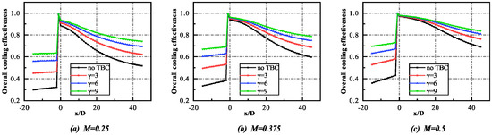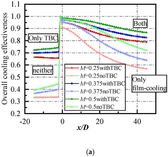 Figure 6 shows the results of , , , and with and without TBCs at different BR under and . Figure 6a shows that the overall cooling effectiveness is best at M = 0.5 with TBC under different BR and with or without TBC. By comparing the two working conditions of film cooling only and TBC–film cooling combined, it can be found that the TBC can slow down the film-cooling effect as x/D increases, thus, making the temperature distribution tend to be uniform. Comparing the four conditions of film cooling without TBC, film cooling alone, TBC alone, and the two together, all scenarios can contribute to the overall cooling effectiveness, and the combined effect of the two is better than that of each alone. This indicates that the coupling effect of TBC–film cooling is the best, and that TBC can be designed in combination with film cooling to work together.