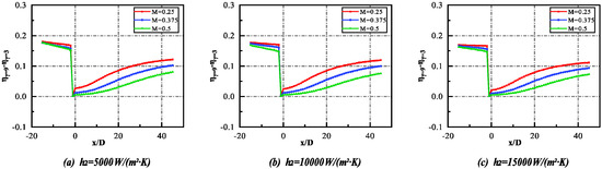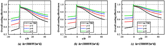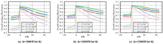 Furthermore, Figure 8 and Figure 9 show that the variation of internal heat transfer coefficient does not affect the gap between the overall cooling effectiveness of M = 0.5 and M = 0.25 and the gap between the overall cooling effectiveness with and without TBC under different x/D. However, Figure 8 demonstrates that the gap between the overall cooling effectiveness of M = 0.5 and M = 0.25 becomes smaller with increasing h2 whether it is with TBC or not, meaning that an increase in h2 weakens the effect of BR on overall cooling effectiveness . Furthermore, it can be shown in Figure 9 that the gap between the overall cooling effectiveness with and without TBC is basically unchanged under h2, varying from to . Thus, the variation of the internal heat transfer coefficient basically does not affect the contribution of TBC on the overall cooling effectiveness.