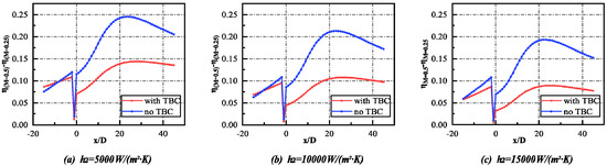 However, when comparing Figure 6b,c, it can be found that becomes highly smaller as the x/D increases, and then the decreasing trend gradually slows down; this variation rule is contrary to the variation rules of and , indicating that TBC and film cooling may weaken each other’s effect. Figure 6a illustrates that TBC has a poor thermal insulation effect at the near-exit of the film-hole with high cooling effectiveness, while at a distance, TBC has a significant effect. It further reveals that TBC and film cooling can be integrated to have a better cooling effect than each alone, but they can only play an effect of .
