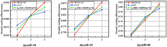 The above influencing factors are divided into low, medium, and high levels, and the overall cooling effect at three different dimensionless distances x/D is chosen as the evaluation index to sensitivity analysis—the result is shown in Figure 13. It shows that film cooling plays a major role in the contribution of the overall cooling effectiveness near the exit of the film-hole, at x/D = 10, while the contribution of TBC is small. However, the contribution of TBC and the internal heat transfer coefficient to overall cooling effectiveness gradually improves as the x/D increases, among which the contribution of TBC improves significantly. The results reveal that TBC has a poor contribution on the overall cooling effect for the area near the exit of the film-hole where the effect of film cooling is good. However, the contribution becomes larger at a distance from the film-hole where the effect of film cooling is poor, on which we should spray TBCs to protect the metal blade.