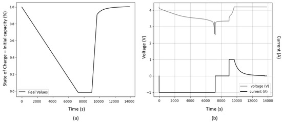 Figure 2a presents the target SoC model, while Figure 2b shows the current and voltage profiles obtained through the initial capacity test. The negative current indicates the battery is discharged, and the positive current shows its charge. It can be seen that even at a constant current and controlled temperature, the voltage has no linear behavior.