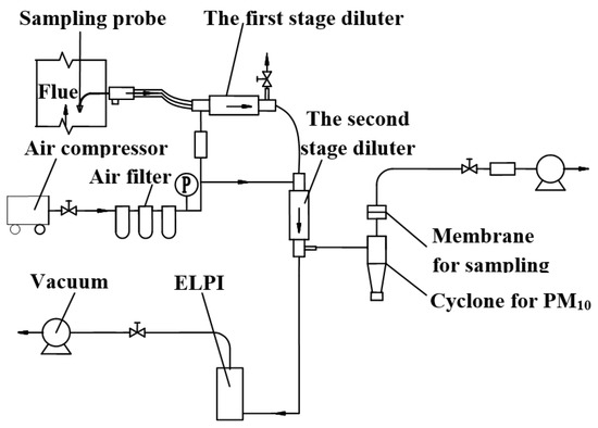 Figure 2 is the diagram of dilution measurement and sampling system used during this work. The flue gas was successively passed by an isokinetic sampling probe, a cyclone for PM10 and two dilution devices that diluted using filtered air. When the pressure in the filtered air supply system was stable at 0.2 MPa, throughout the sampling process, the dilution ratio (about 9-fold) was stable, so the entire dilution system could keep a stable dilution ratio of about 80 times. The first stage diluter needed to be heated and injected with heated air to avoid water and acid condensation.